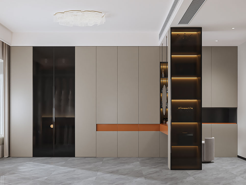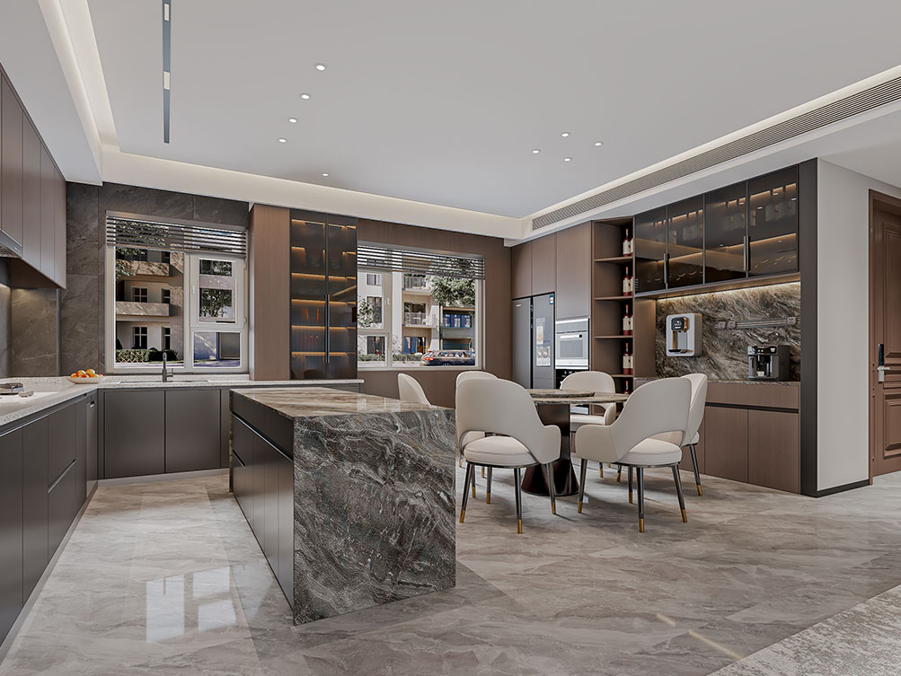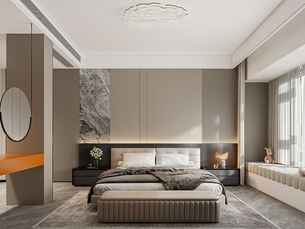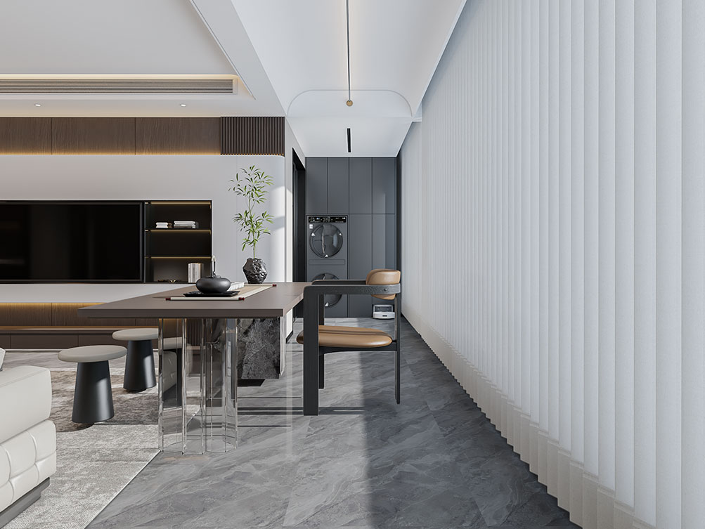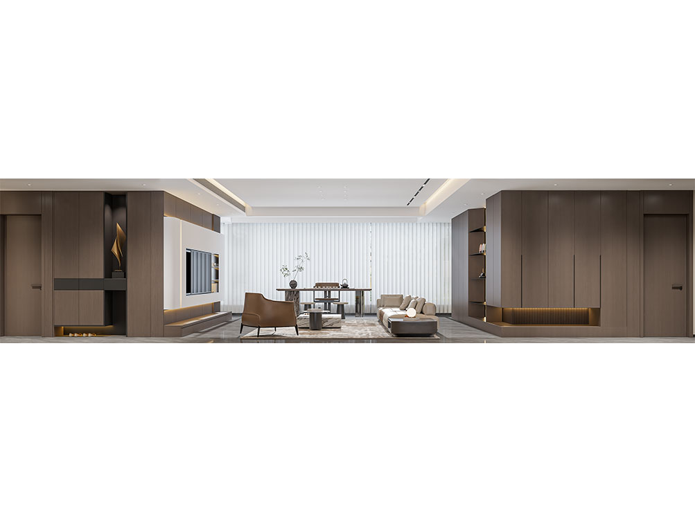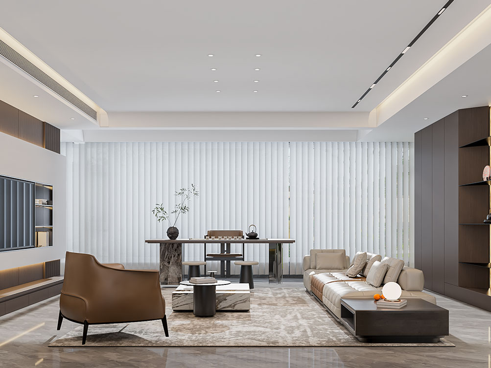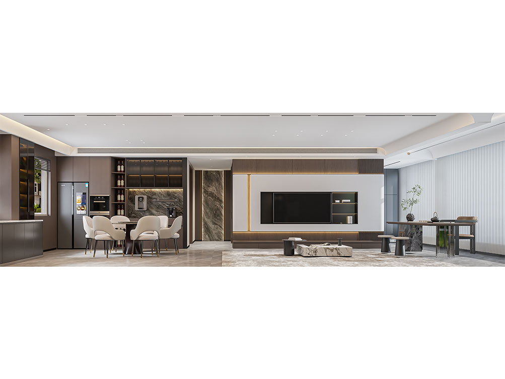 ??中電建國譽(yù)府的這套裝修,以現(xiàn)代輕奢為調(diào):淺棕沙發(fā)搭深色柜體,大理石紋理家具襯雅致地毯,無主燈設(shè)計(jì)揉入線性光,百葉窗引柔光滿室。既呼應(yīng)項(xiàng)目鋁板幕墻的極簡美學(xué),又用新中式擺件襯出雅致質(zhì)感,把低密社區(qū)的松弛感揉進(jìn)了空間里。